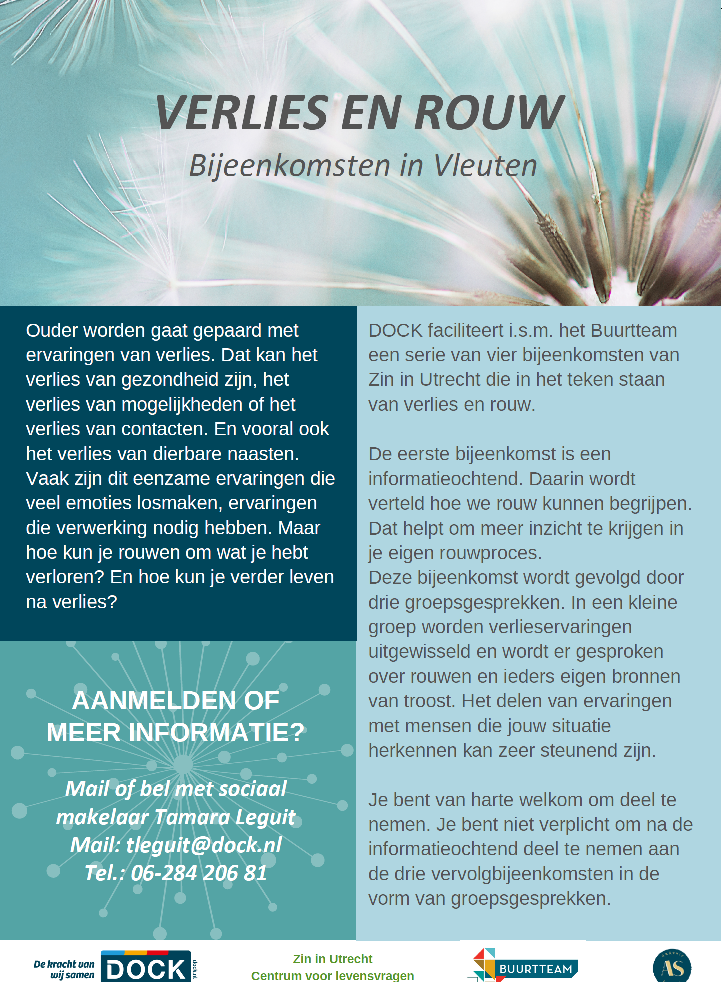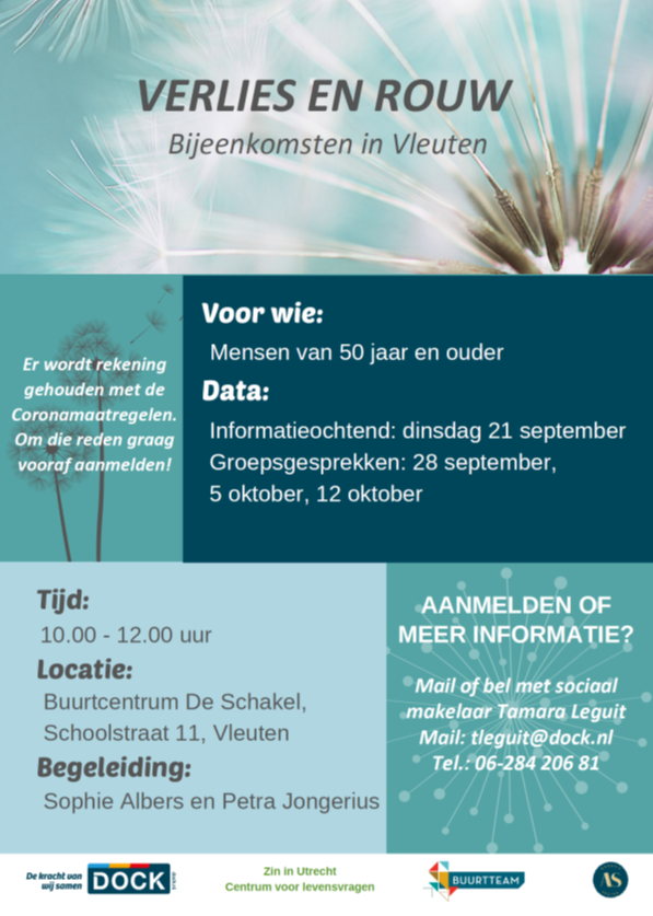 In samenwerking met DOCK en het Buurtteam bieden wij een serie van vier bijeenkomsten die in het teken staan van verlies en rouw voor 50plussers. De eerste bijeenkomst is een informatieochtend die helpt om meer inzicht te krijgen in je eigen rouwproces. Daarna volgen drie groepsgesprekken. In een kleine groep worden verlieservaringen uitgewisseld en wordt er gesproken over rouwen en ieders eigen bronnen van troost. De begeleiding is in handen van onze geestelijk verzorger Sophie Albers en onze vrijwilliger Petra Jongerius. Informatieochtend: dinsdag 21 september. Groepsgesprekken: 28 september,5 oktober, 12 oktober om 10.00 – 12.00 uur in Buurtcentrum De Schakel, Schoolstraat 11, Vleuten. Opgave: tleguit@dock.nl of 06-28420681.
