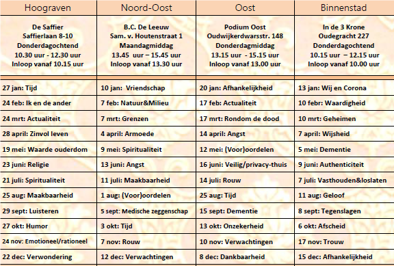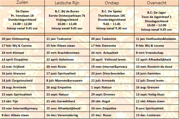 Stichting Zin in Utrecht biedt in 2022 in 7 Utrechtse wijken, elke maand bijeenkomsten aan waarin zingeving en ouder worden centraal staan.